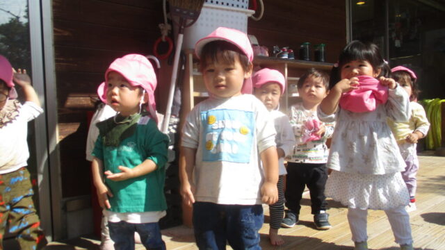 0歳児 ポッポ組 大好きな外遊びにままごとを合体しピクニックをしました。気候も良く秋らしい空気のなかで楽しんで遊ぶことが出来ました 2歳児 ビーバー組