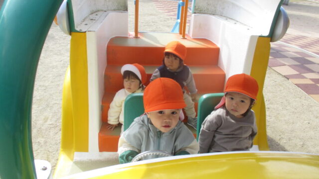 0歳児 ポッポ組 上手に歩いて自由に外遊びを楽しめるようになったポッポくみさんの子どもたち。友だちが乗っていると気になってバスの乗り物へ集まってきました。