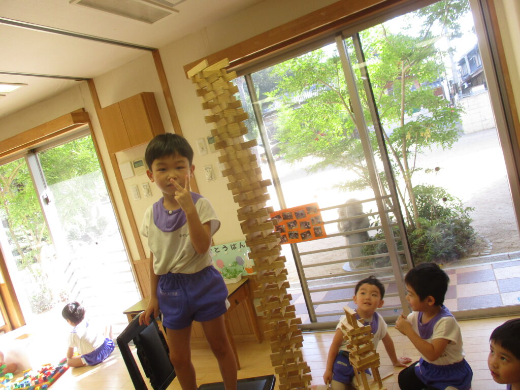 カプラという積み木のおもちゃをバランスよく積む遊びを根気よくしていました。子どもたちの感覚は素晴らしく、1つズレると崩れそだと感じるようで慎重に進めていたものが高くなることが嬉しくて仕方ない様子でした