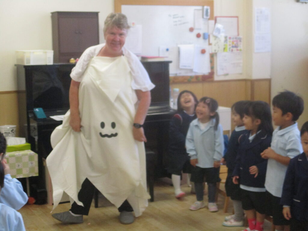 Let’s enjoy!英語の時間に、講師の先生とハロウィンについてゲームや絵本を見て楽しく学びました。【スケルトン】【ウィッチ】【ジャックオーランタン】など色々と登場してくることを知りました