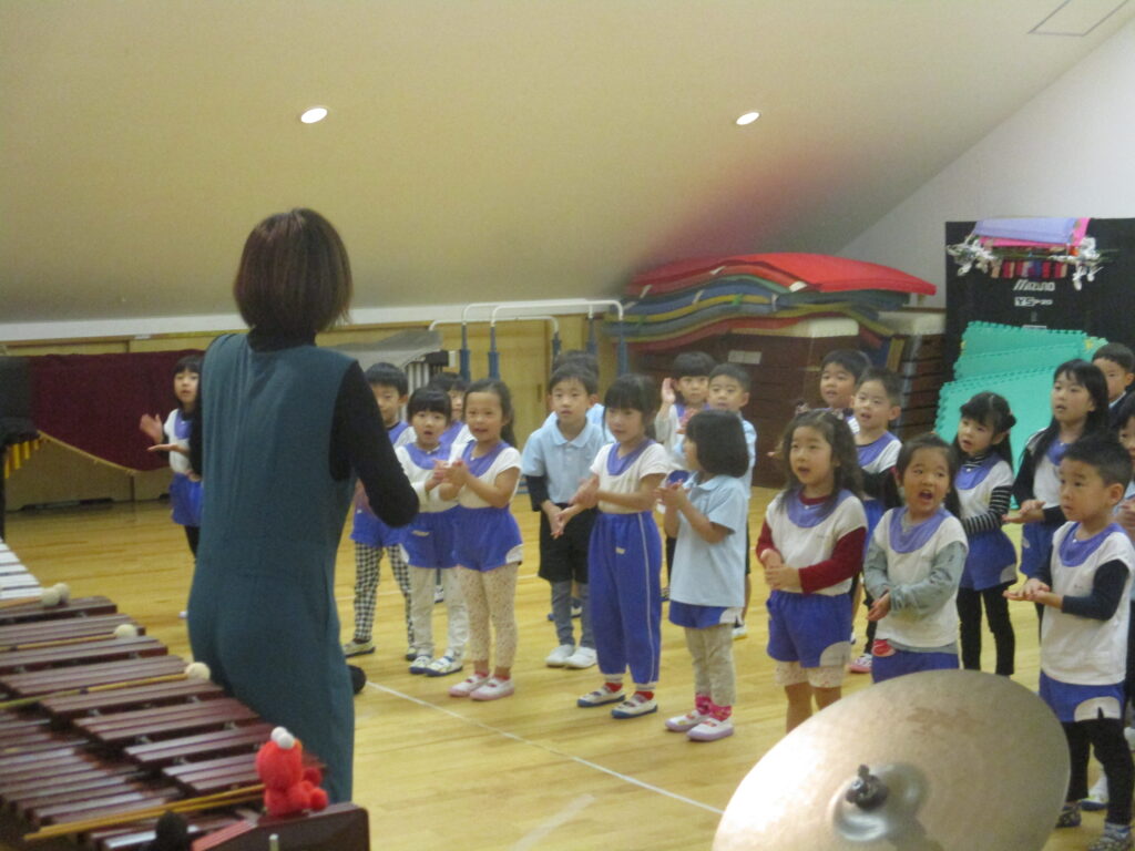 楽しい音楽の時間ですパーカッションの演奏家の方をお招きしてのお楽しみ会がありました。音楽会に実際に使う楽器の音を生演奏で体感することができました。音の違いに驚き、体もボディーパーカッションとして楽しめると教えていただきました。