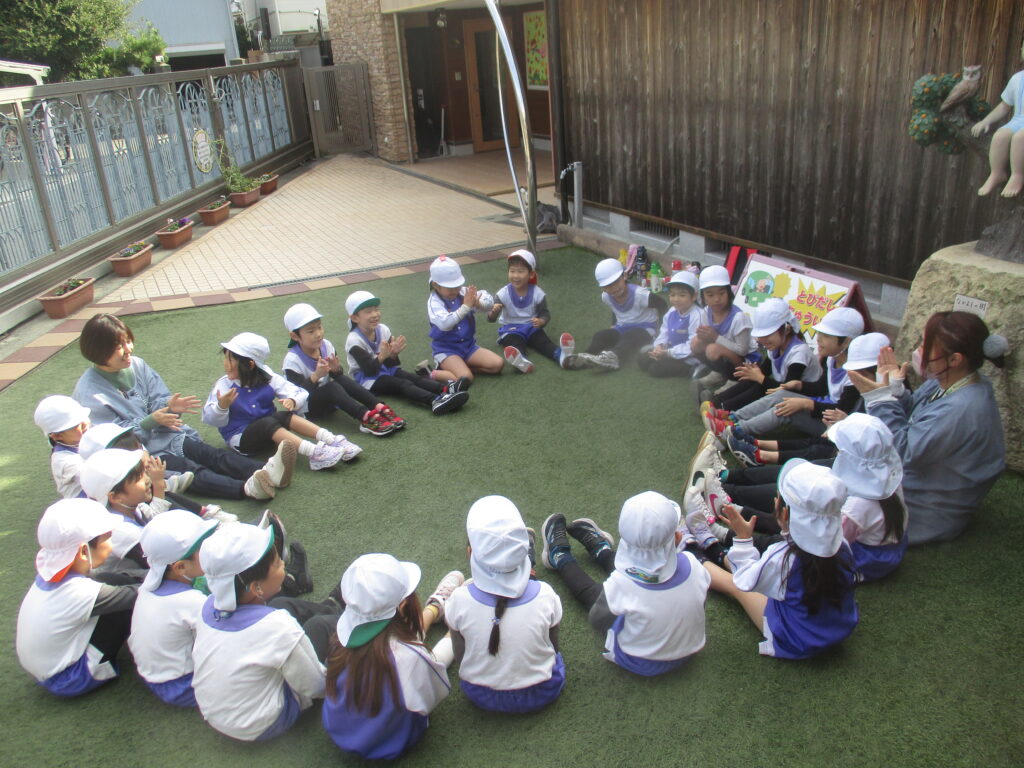 ひなたぼっこ芝生の上に座ったナータさん。『ひなたぼっこ気持ちいい!』と話していました。いつもは体を動かすことが大好きな年長さんですが、こんなにゆったりした外遊びもいいものです