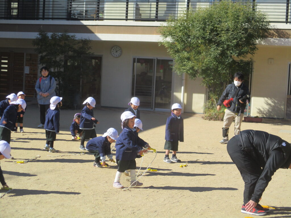 なわとび大会園内でコッコさん初めての【なわとび大会】に参加しました。運動会でもらったなわとびを使ってこれまで体操の先生と一緒に色々な跳び方や、使い方に挑戦してきました。この日は上手に出来るようになったことを見せ合いっこする日です。回してピョン!繰り返してできることも発見していました。賞状ももらって喜んでいました。