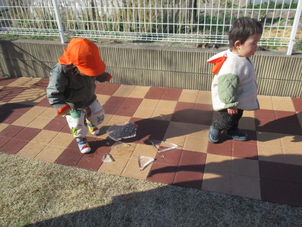 なんだこれ?外遊びに出かけました。自由に歩いたり滑り台に登ったり楽しんでいたところ、突然に【氷】に出会い、立ち止まっては見たけれど、じーっと見てはみたけれど、触ることはできませんでした