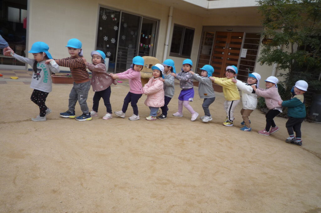 つながってまぁす園庭に大きく描かれた線路に沿って歩きます。離れないように、線路からはみ出ないように、でもスピードもつけたい!そんなドキドキが詰まった遊びでした。