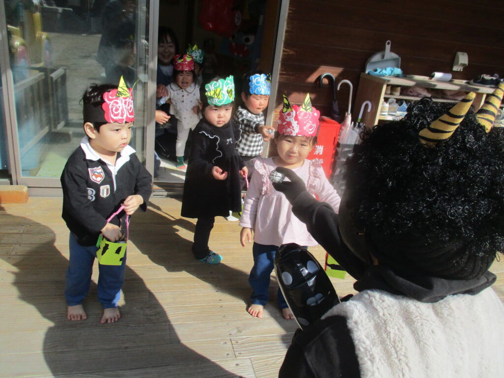 可愛いおにが来たよ園に鬼さんが遊びに来てくれました。パンダの子どもたちは、最初は驚いていましたが、【おまめどぞ~】と手渡してあげていました。豆まきは室内で力いっぱいしていました