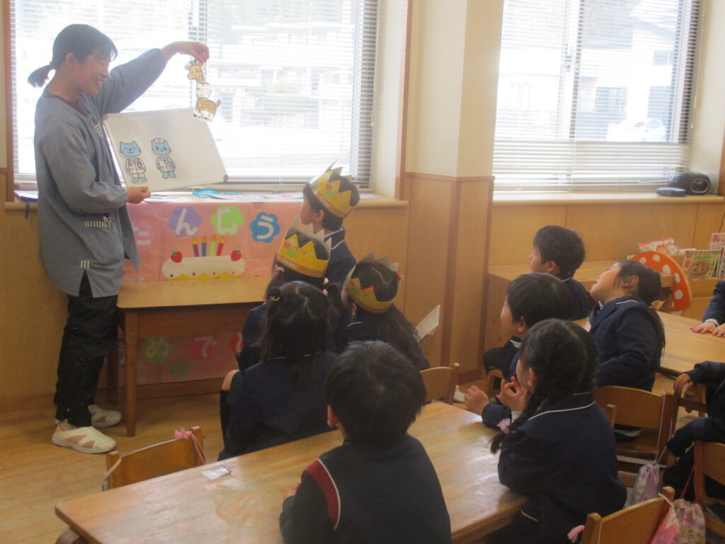 みんな4歳になりました最後の誕生日会の日『これでみんな4歳やで』と話す声が聞こえてきました。毎月誕生日を迎える友だちを祝う心と、期待して待つ心が育っていました。おめでとう!