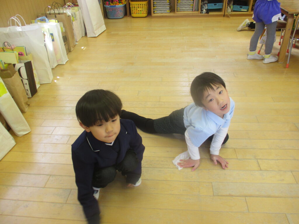 きれいになーれ1年間過ごしたお部屋をみんなで掃除してくれていました。床についてしまったクレヨンの跡やシールの跡を強い目で見て見つけては力を込めてしっかりと取ってくれていました。次のお友だちが気持ちよく使えるねと先生とも話していました。有難う