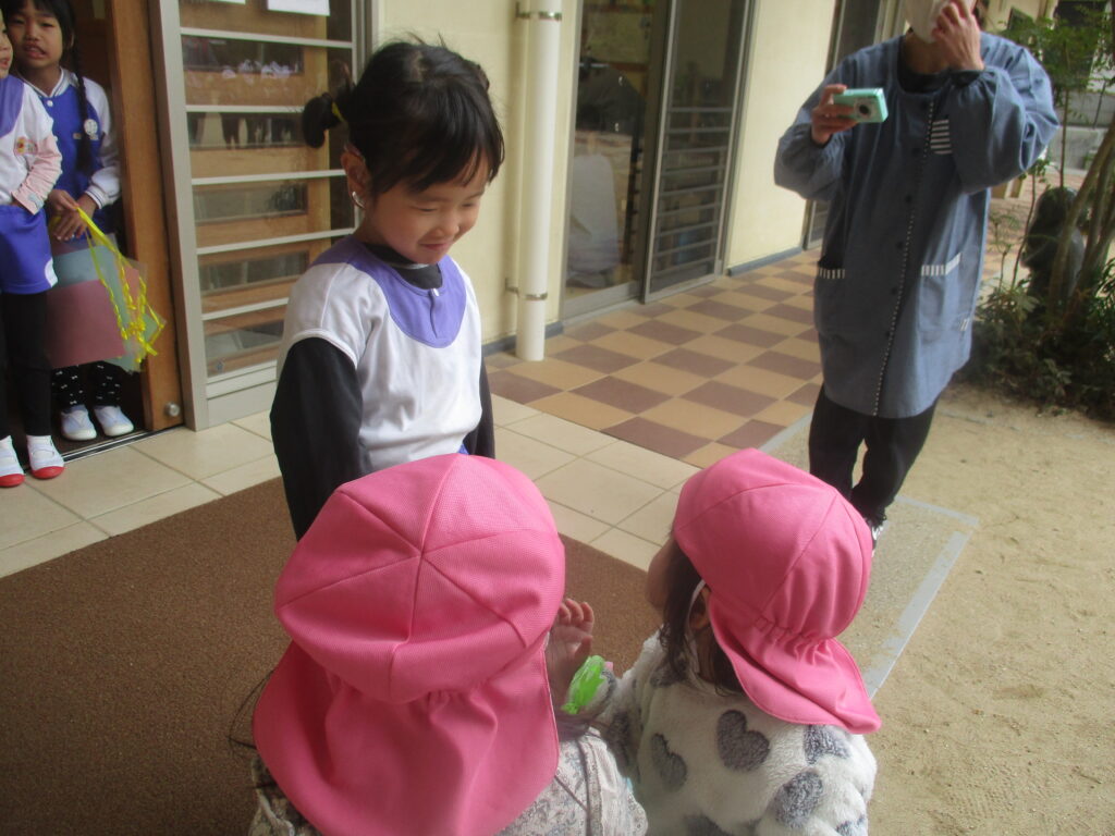 ありがとうもうすぐ小学校へ行く年長さんに小さなお友だちから『頑張って‼』のプレゼントをわたしに行ってきました。素敵なプレゼントに喜んでくれたお兄ちゃんお姉ちゃんを見て思わずにっこりでした。