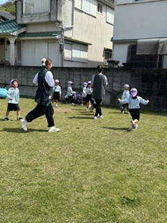 友だちとも先生とも仲良くなってきたバンビさん。先生も仲間に入って追いかけっこで賑わっていました。
