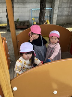 園庭で遊んでいたらバッタリ出会いました。違う年齢の友だちとも仲良く遊べます。