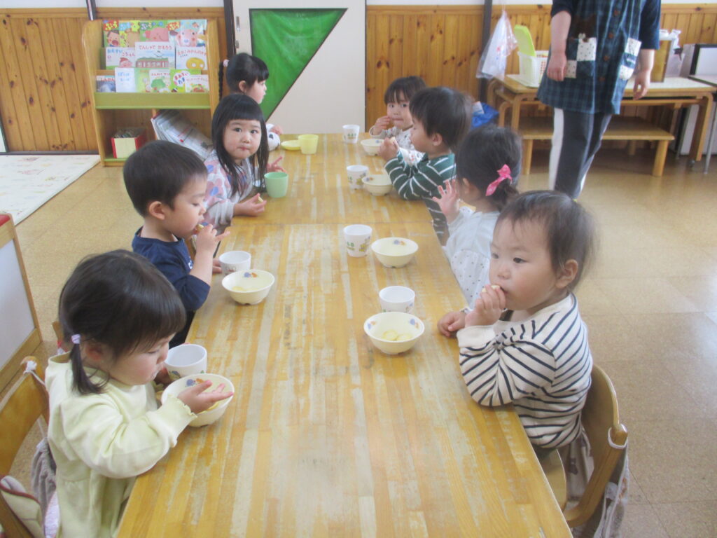初めてのビーバー組のお部屋でおやつタイムです。この後は元気いっぱい外で遊びました。