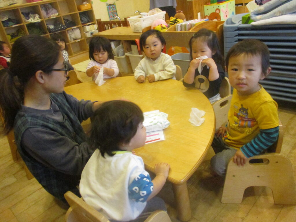 新しいクラスが始まりました。沢山のお友だちに囲まれて楽しく歌を歌ったり、絵本を読んだりしました
